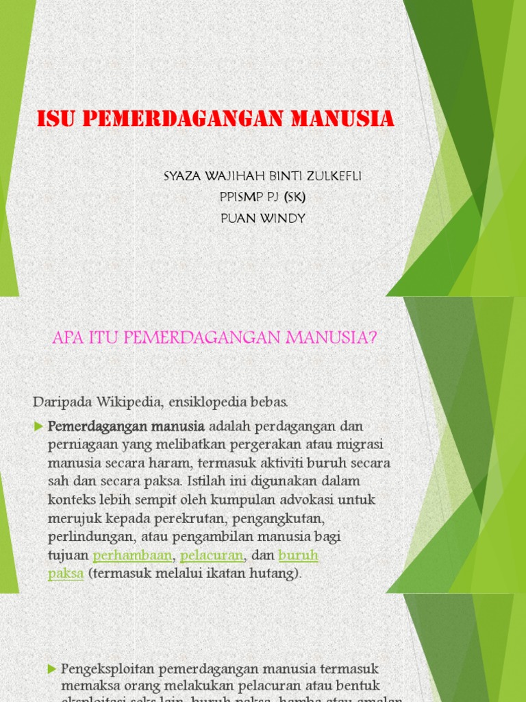 Pemerdagangan orang adalah segala perbuatan yang melibatkan pemerolehan atau pengekalan tenaga kerja atau perkhidmatan seseorang melalui paksaan dan termasuklah perbuatan merekrut, mengangkut, memindahkan, melindungi, menyediakan atau menerima seseorang. Isu pemerdagangan manusia bukanlah suatu isu yang baru timbul di negara ini. Seringkali pemerdagangan manusia ini melibatkan mangsa yang dianiaya dan dieksploitasi untuk kepentingan dan keuntungan pihak yang. Check 'pemerdagangan manusia' translations into english. Membantu golongan kurang bernasib baik, memberikan bantuan keperluan asas dan perubatan, menentang pemerdagangan manusia, menyantuni setiap individu sebagai manusia. Salah satu kesan aktiviti pemerdagangan manusia adalah mencemarkan imej negara di mata dunia. Aktiviti pemerdagangan manusia sering dijadikan tajuk utama akhbar harian, tidak kira dari negara mana sekalipun. Pdf | pemerdagangan manusia dikenali sebagai perhambaan zaman moden yang memerlukan komitmen tegas dari negara untuk menghapus dan mencegah. Pelbagai usaha perlu dijalankan untuk mengurangkan masalah tersebut. Masalah ini akan mendatangkan banyak kesan buruk jika tidak ditangani dengan segera dan e. Dan fokus malam ini tertumpu kepada pemerdagangan manusia. Aktiviti meliputi segala bentuk eksploitasi sama ada untuk tujuan seks, kerja paksa, perhambaan, dan. By nicholas_vlee in types > creative writing and langkah mengatasi pemerdagangan.
